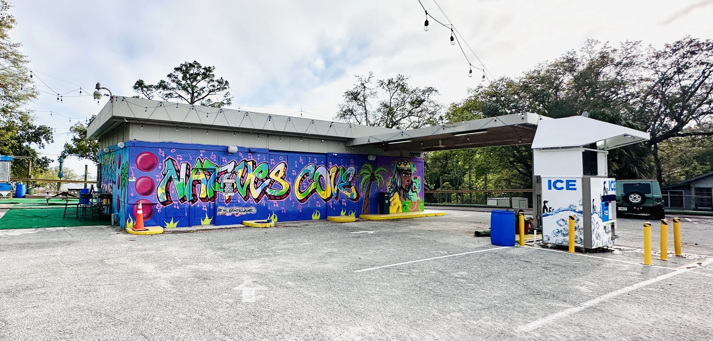 Right in front of the Natives Cove. Overflow parking is available to the on either side of 101 W Miracle Strip Pkwy